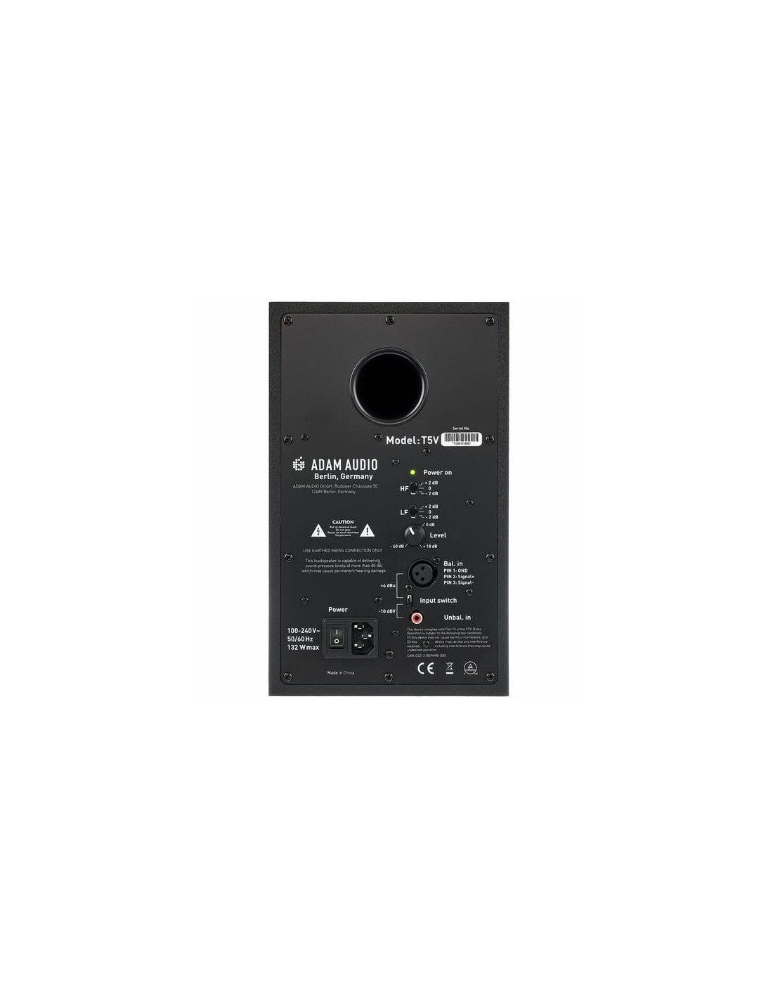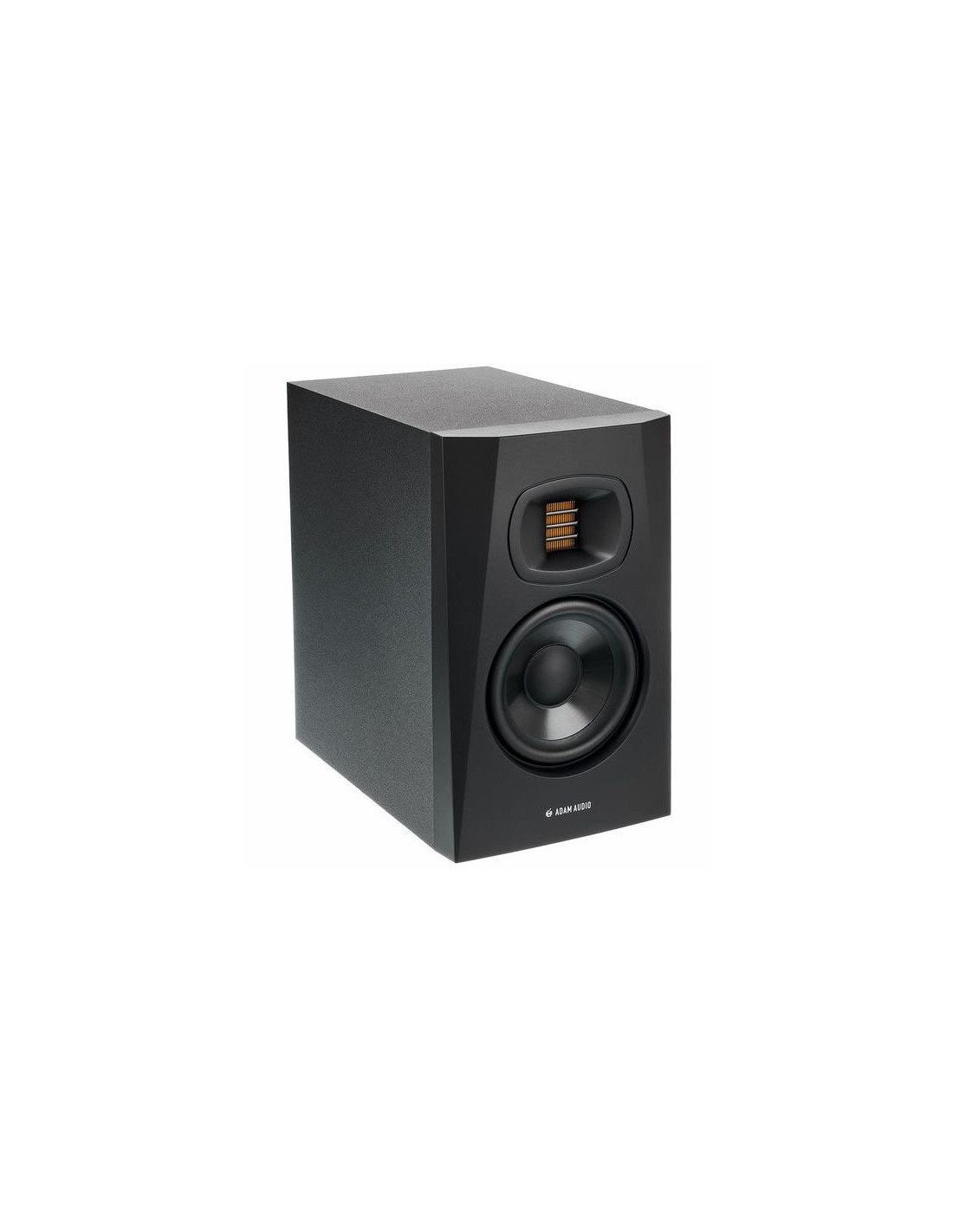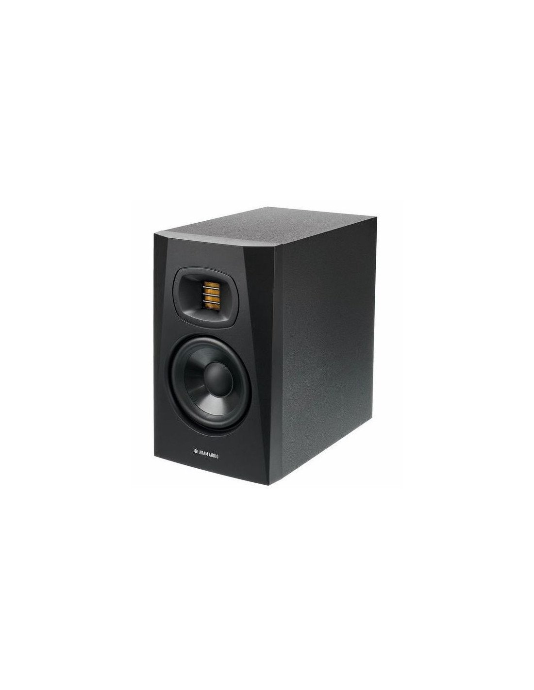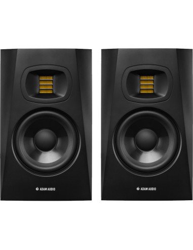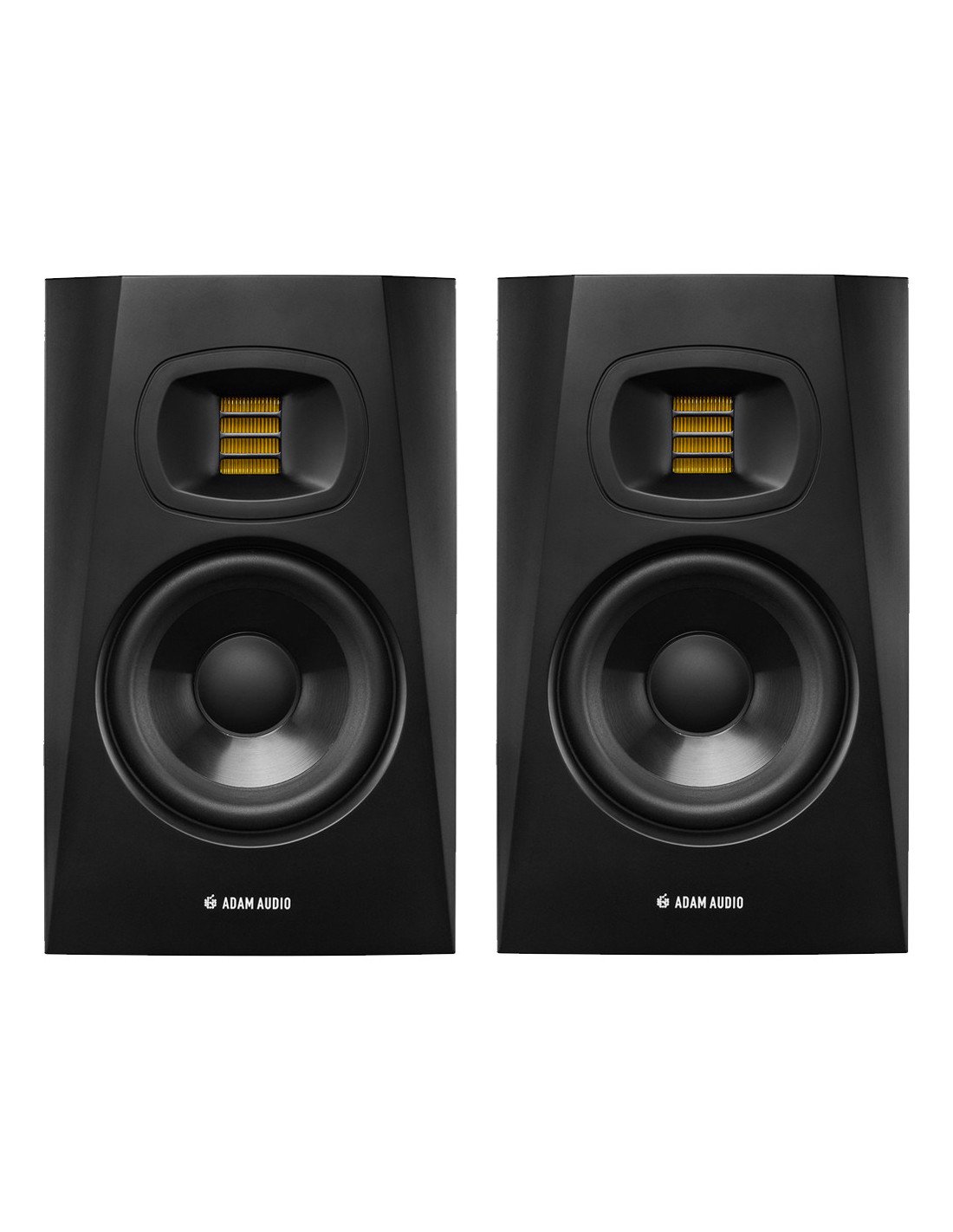 Set de monitores de estudio ADAM AUDIO T5V de Audio de Campo Cercano. Con su woofer de 5 pulgadas, la respuesta de frecuencia de bajos de los T5V se extiende hasta 45 Hz. El nuevo tweeter U-ART, una solución revolucionaria para grabación y mezcla de alta resolución en un presupuesto ajustado, alcanza hasta 25 kHz y está acoplado a una guía de ondas de precisión con las mismas propiedades de control de dispersión que la guía de ondas de Alta Frecuencia (HPS) utilizada en los monitores insignia de la serie S de ADAM Audio.