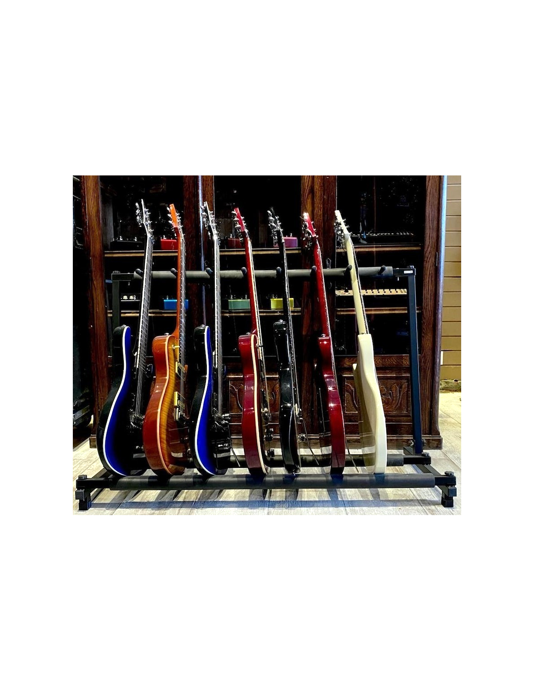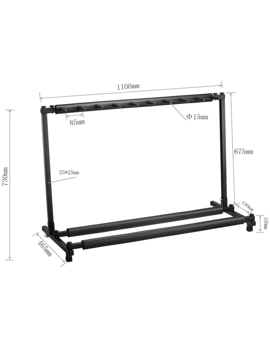 Soporte en rack ARTINY JYC-J-P9 para 9 guitarras o bajos soporte múltiple para guitarras con capacidad para 9 instrumentos, diseñado con un resistente tubo cuadrado de 2525 mm. Sus dimensiones de 1100465*700 mm ofrecen una estructura espaciosa y robusta para mantener de manera segura tus guitarras. Este soporte proporciona una solución eficiente y elegante para exhibir y organizar tus instrumentos musicales de forma ordenada.