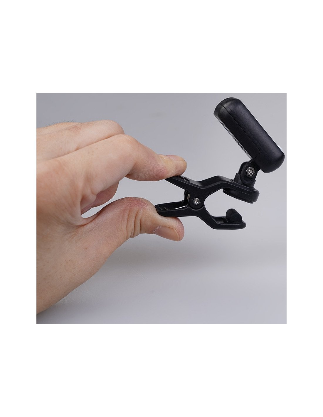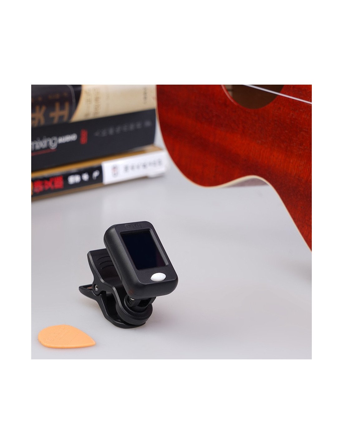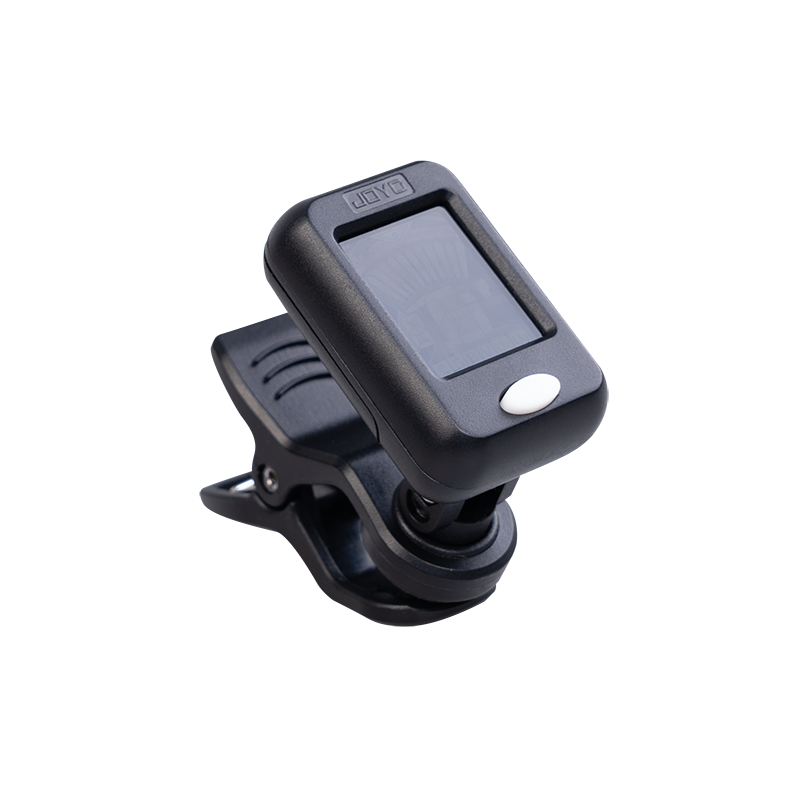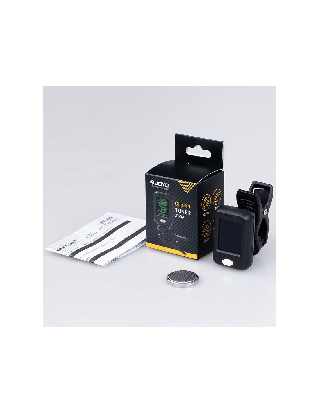 Afinador JOYO JT-09 digital cromático de pinza, para ser usado en guitarras, bajos, violines y ukeleles. Trabaja sobre una frecuencia 440Hz. Rango de afinación 0A-8C. Precisión: +-1 cent. Alimentación por batería tipo moneda.